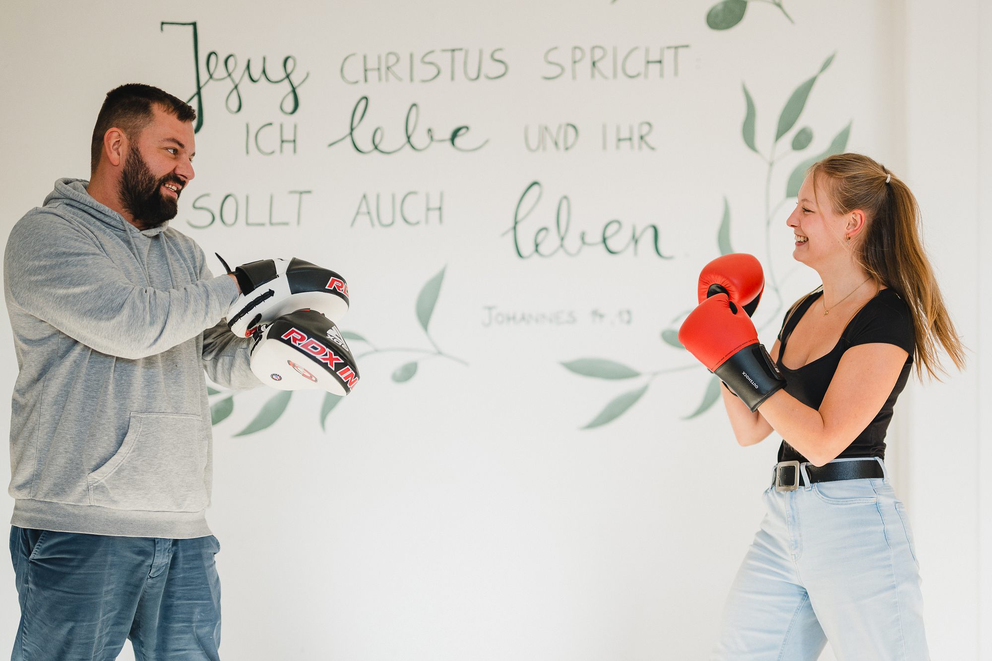 Ein besonderes Highlight waren dynamische Aufnahmen, unter anderem ein inszenierter „Boxkampf“. Diese Bilder symbolisieren den inneren Konflikt vieler Hilfesuchender – den Kampf gegen Abhängigkeit, Scham und Hoffnungslosigkeit.